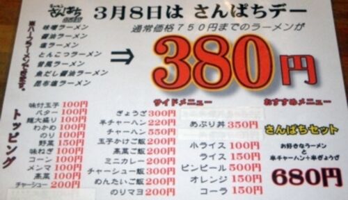 毎年恒例の感謝デーなんだけど去年迄と違い,今年から1日のみ3/8の「さんぱちデー」となってるのを先日店頭チラシで知る.ナウキャスト見ると雨雲出てねし,もう止んでると思うものの防水ジャケット着て出れば依然いやらしく降ってて憂鬱.ちと早めに出…