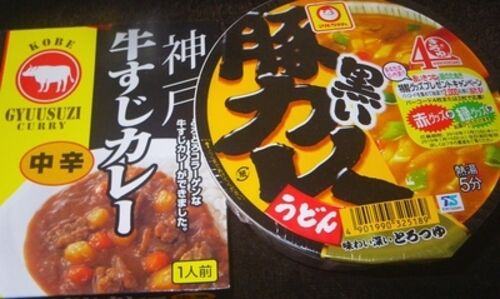 天気いまいち気温も低目で出る気失せる.賞味期限今月末のカップ麺2つ.これもシーズン終わりだなと黒い豚カレーうどんチョイス.でもってかなり温存してるレトルトカレーチェックすると賞味期限今日迄の「神戸牛すじカレー」(何かで評判見たかドンキでやた…
