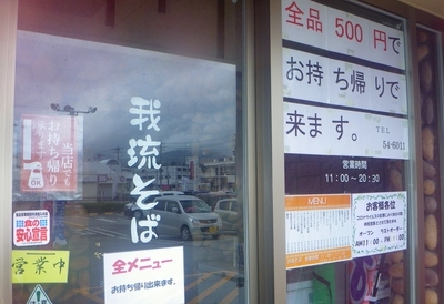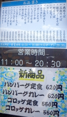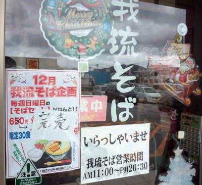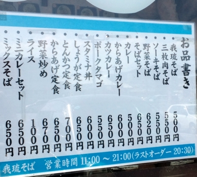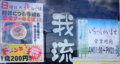 日替わりも無く,メニューそれ程多くないのは(写真の数字見ると取り敢えず14品は有るのか?)未だ開業間もないてことでこれまた仕方ないとこ.サービスデーも今のとこ特に無い様子だが今後に期待.しかし特にそばが一押しって感じでもないのに(ソーキそばの550円は微妙に安いかも),何故店名に「我琉そば」ってそばの名を付けたんだろか?