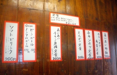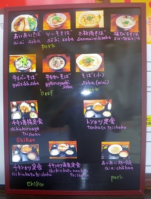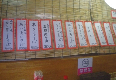 11h50扉入ると左側厨房でカウンター5席空いてて一番手前にする.デカい人座ってたら後通るのがちと大変そうな細い通路の向こうどうなってるか見えねけど先客何組か居るイキフン.店人3人(夫婦?と若い兄ちゃんで息子か兄弟?).当初そばだけだったかどうかは確認してないが定食も有る.テーブルにメニュー置いてなく前と後の短冊だけなんで一通り眺めて考える.初回から定食てのは無いな.「牛もやしそば」行きたい気もするが800円に躊躇.ここはやはり定番の「そば(小)+ジューシー」だ.しかし増税見越して当分この値段でやるってことなんだろうけど「そば(小)」が600円,他のそばは800円以上つうのはいささか高目の設定で正直驚く(定食も680円からとちと厳しい).