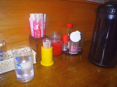 普通サイズの渋い茶碗のじゅーしーあまり濃くない茶色がかって割とパラパラ味もそんなに濃くない(肉はいまいち確認できず).漬物イチョウ3枚心なしかワサビ風味.そのまま食べ進めてて終盤殆どスープだけになっちまってから,水差しの陰に紅生姜とオリジナル魚粉とやら置かれてるのに気付く Orz. 魚粉少しスープに足して完食.支払ってトイレに手を洗いに行き奥側の席チェック.6人掛け2卓,せいぜい4人てとこの堀テーブル2卓.ドア開けたらトイレと思いきや建物の裏でちと驚く(元は共同使用だったのだろうか).入ってみてまたビックリ中和風庭園みたいな大振り玉砂利と石敷き詰めてあってやたら小奇麗.