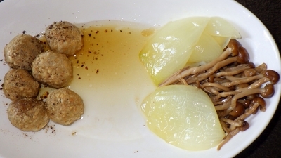 少し自然解凍しといた冷凍鶏肉団子,玉葱,ぶなしめじにユーロリーブライト掛け回し,ブラックペッパー掛けて軽くレンジ加熱.玉葱固くてだけ取り出して追加熱.